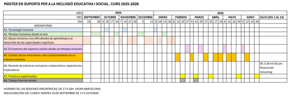(*) Les sessions sincròniques s’impartiran els divendres a la tarda; si bé això no vol dir que tots els divendres hi haurà una sessió sincrònica de cada assignatura/ curs d’ especialització.